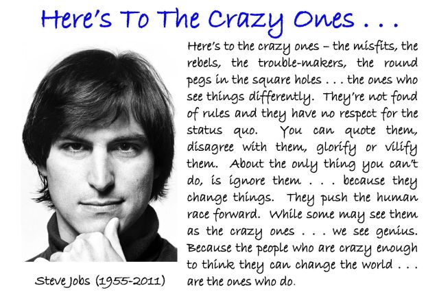 The narrative contained in the below video (and memorialized in the image above) was used in various advertising spots upon his triumphant return to Apple as its trail-blazing CEO, after having been forced to resign in disgrace over a decade earlier. Its message epitomizes the culture he created at an entity he rescued from bankruptcy and eventually turned into the highest valued company in the world. It also represents a lasting legacy that can be applied to ANYTHING worth pursuing and celebrates the creativity that lies within EVERYONE.